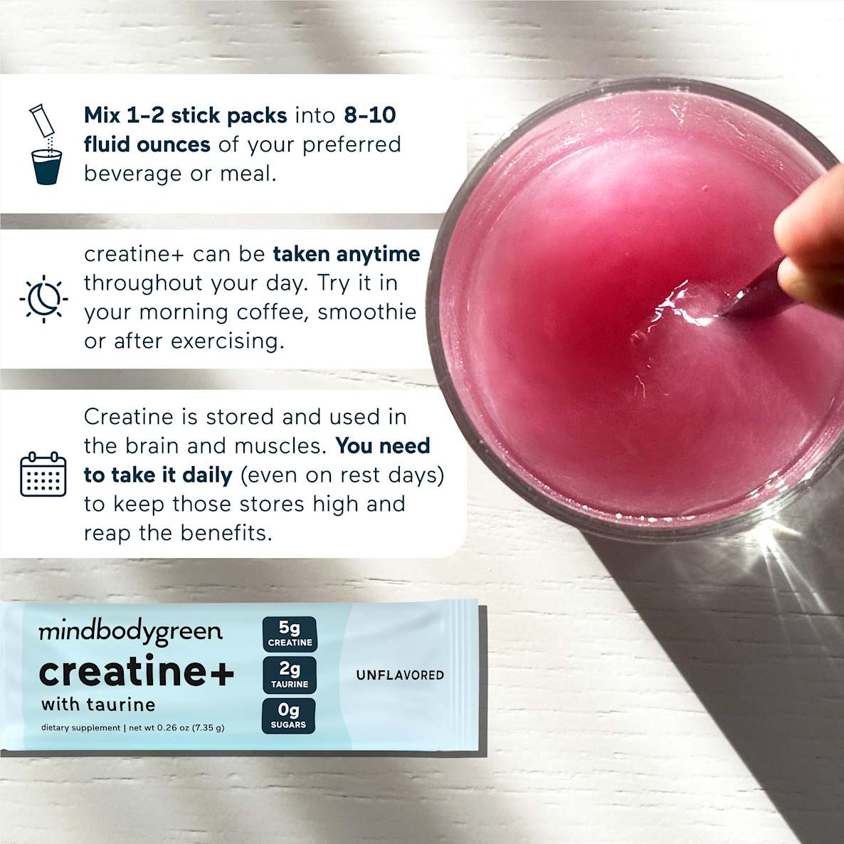 Mix 1-2 sticks in 8-10 fluid ounces of your preferred beverage or meal daily to start seeing benefits of creatine+ over time.*†